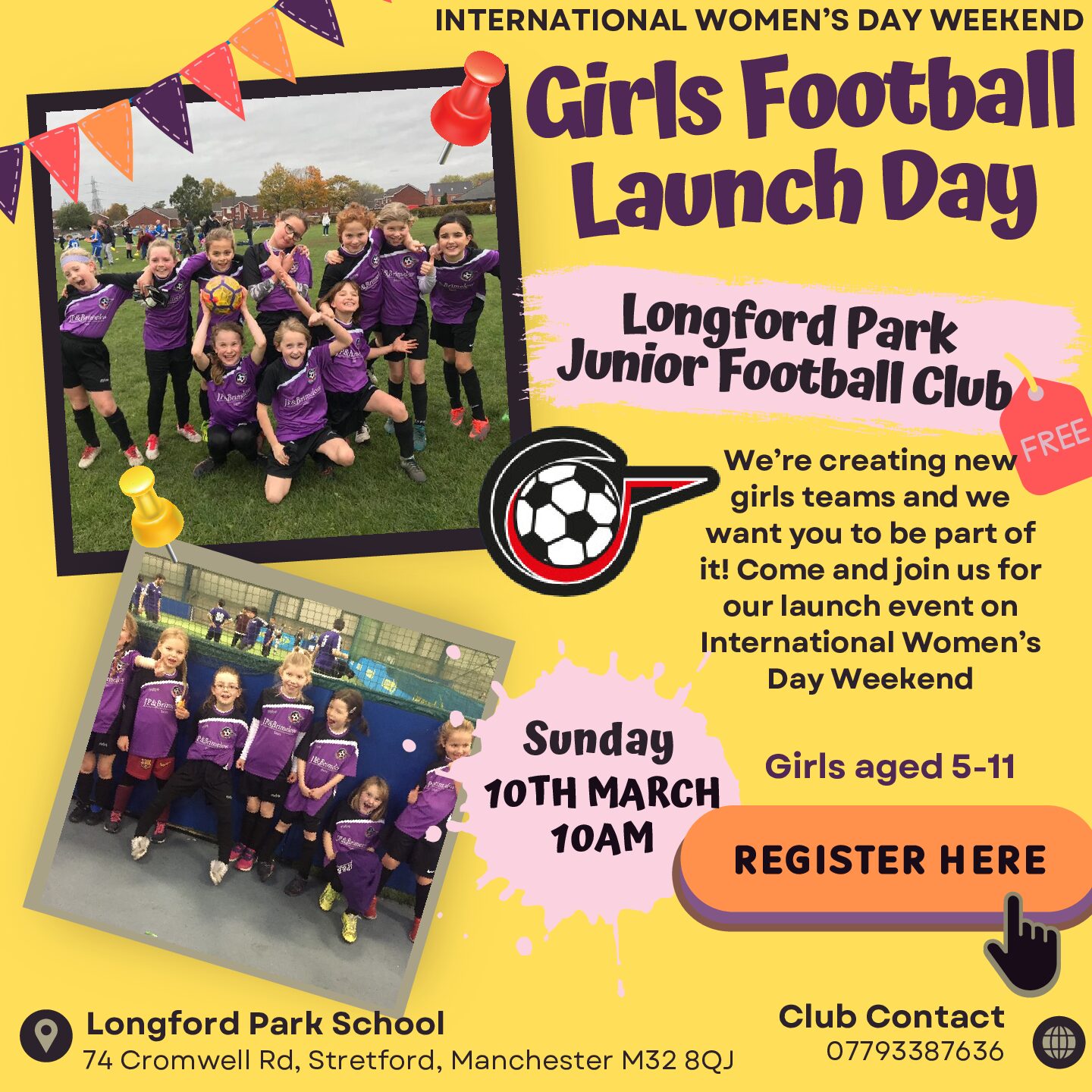 Longford Park JFC will be running a free girls-only introductory football session to coincide with International Women’s Day Weekend on Sunday 10th March @ 10am.