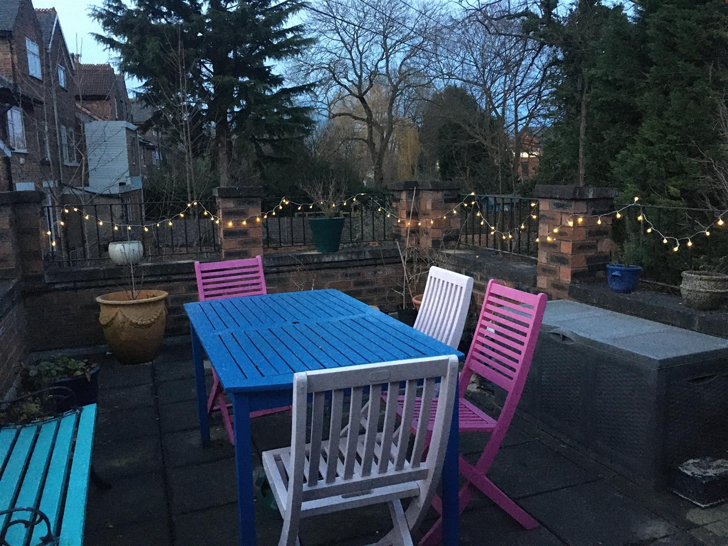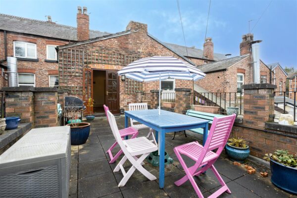 An enclosed patio terrace by the way of a low level brick boundary wall with decorative railings. Finished off with a paved patio ideal for a table and chairs.