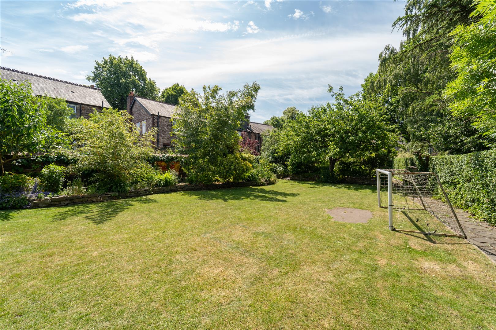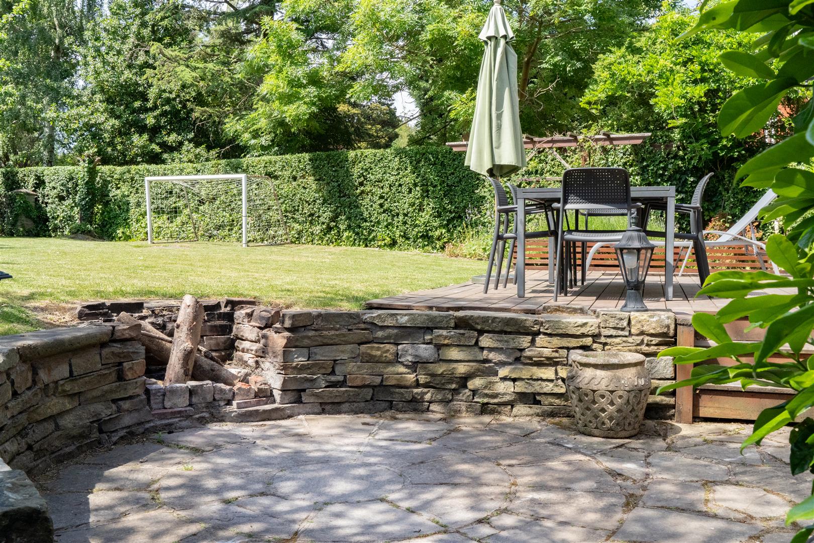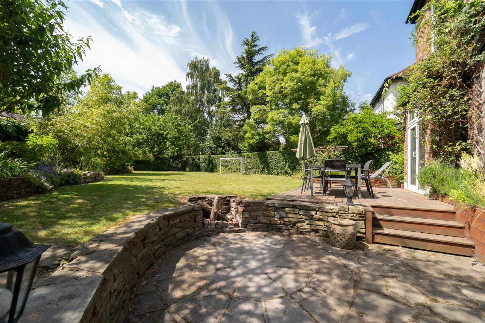 The considerable sized and impressive private lawned gardens are enclosed with a brick boundary wall and a well-established privet hedgerow. A raised paved patio area and several further areas are ideal for private seating and Al-Fresco dining. a built in fire pit and well-attended stone flower beds border this stunning lawn filled with an array of flowers, apple trees and plum trees.