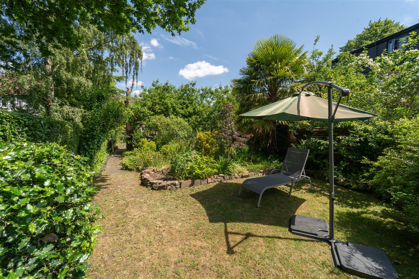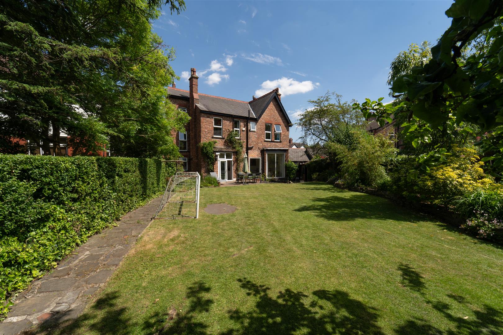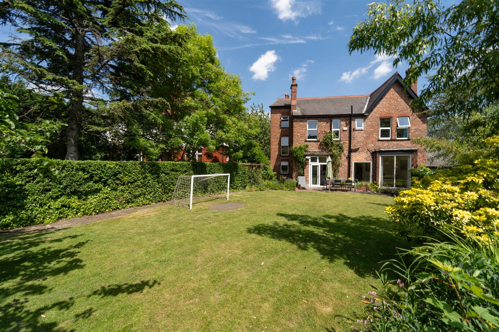 The considerable sized and impressive private lawned gardens are enclosed with a brick boundary wall and a well-established privet hedgerow. A raised paved patio area and several further areas are ideal for private seating and Al-Fresco dining. a built in fire pit and well-attended stone flower beds border this stunning lawn filled with an array of flowers, apple trees and plum trees.