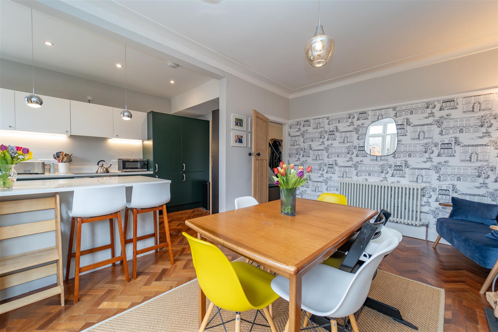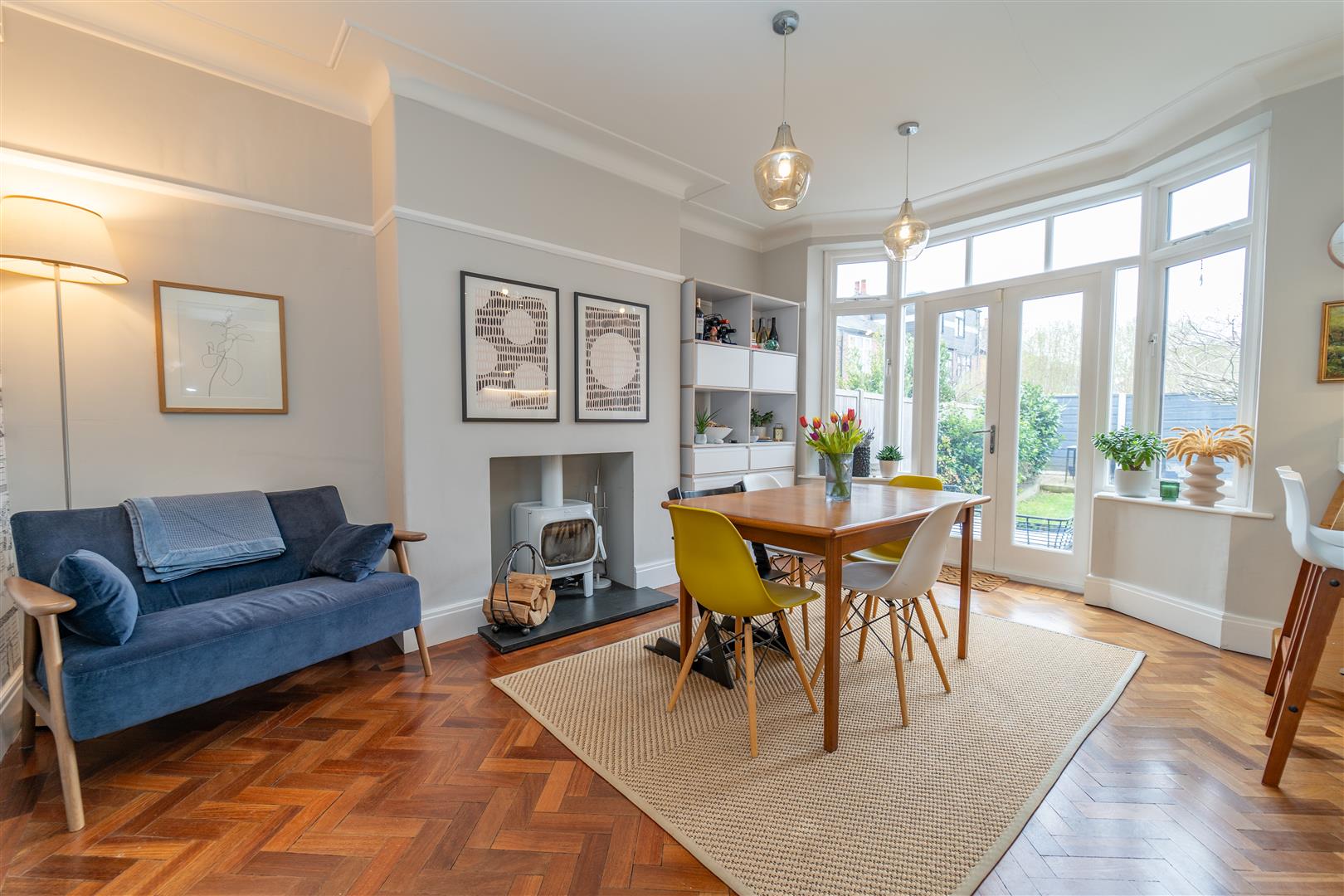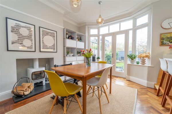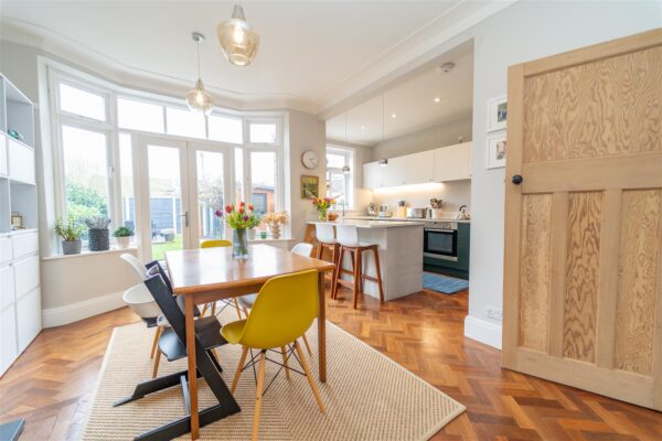 The well-planned accommodation comprises an entrance hallway with under-stair storage, a lounge with a bay window to the front aspect, a dining room with double doors leading out into the rear enclosed garden and a stylish fully fitted Kitchen with high-specification appliances. The downstairs is fitted with parquet flooring throughout.