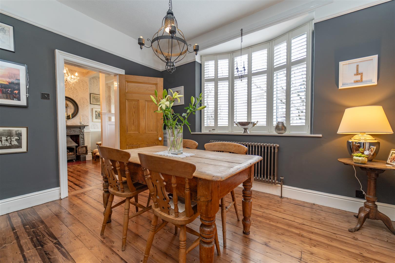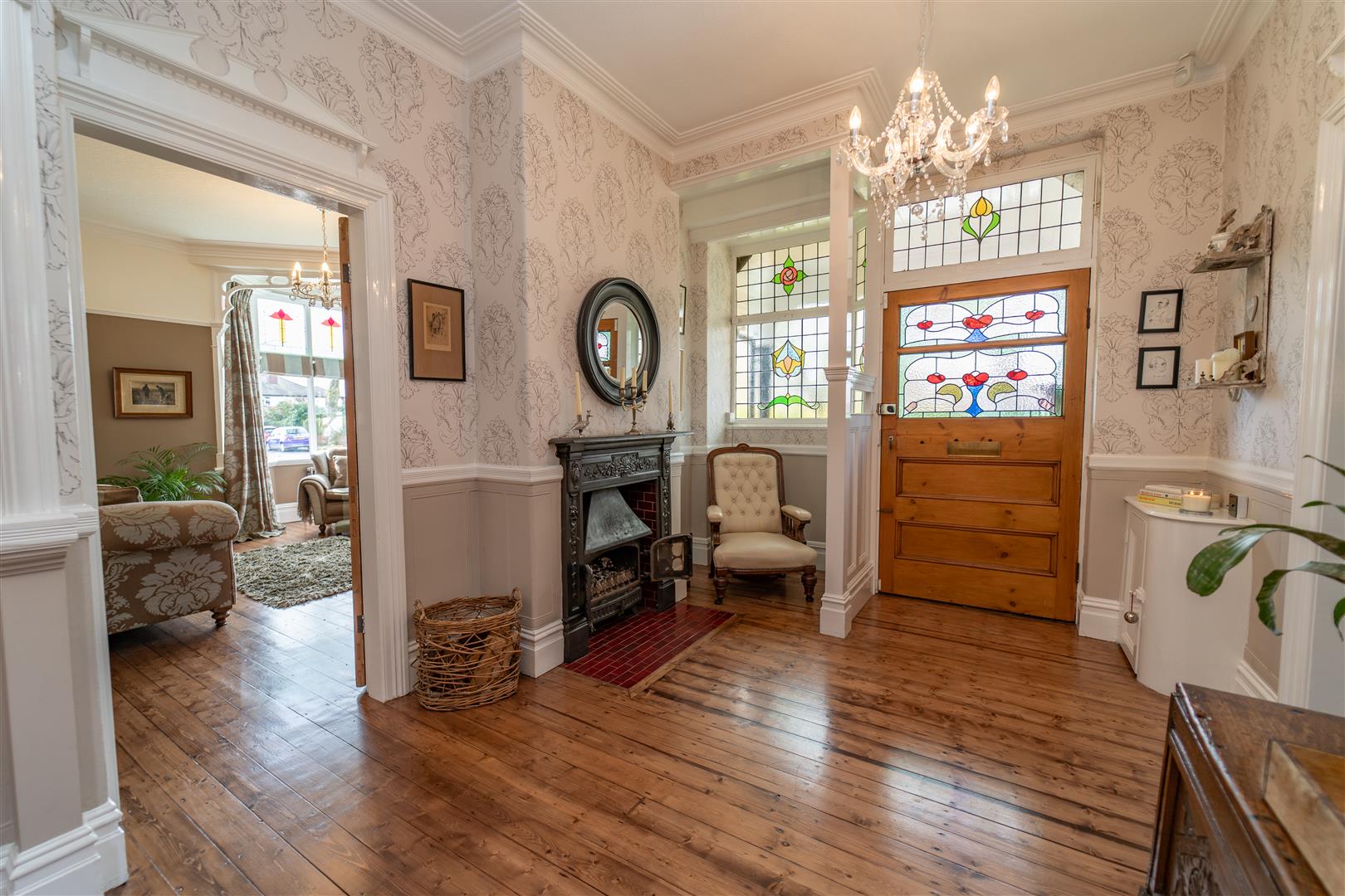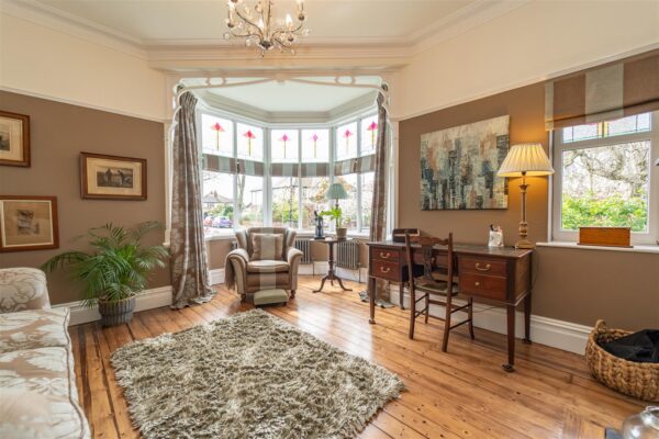 Access is gained through a striking entrance reception hallway leading to three reception rooms, an inner hallway, utility room and a downstairs three-piece shower room. There is a sitting room with a stained and leaded bay window to the front aspect, a dining room through to a fitted kitchen and a lounge with a stunning fireplace and views to the front lawned garden.