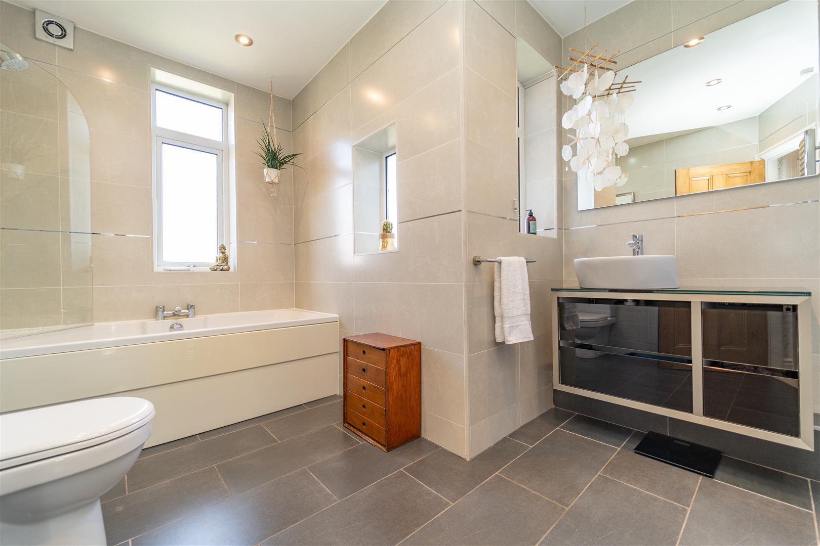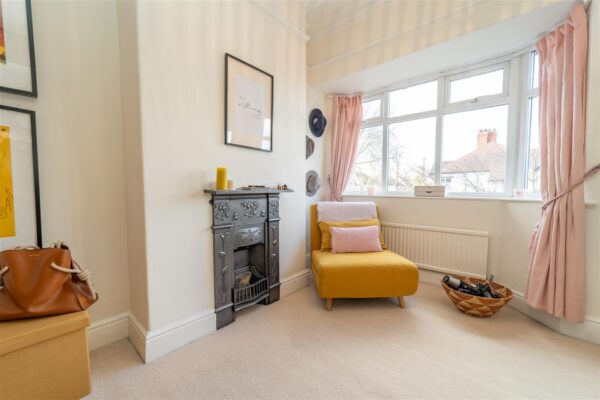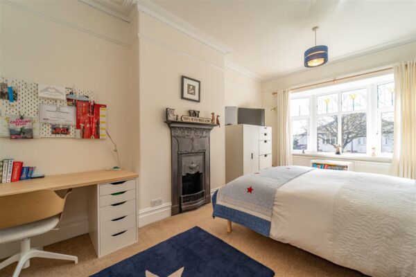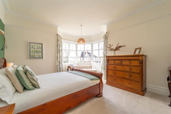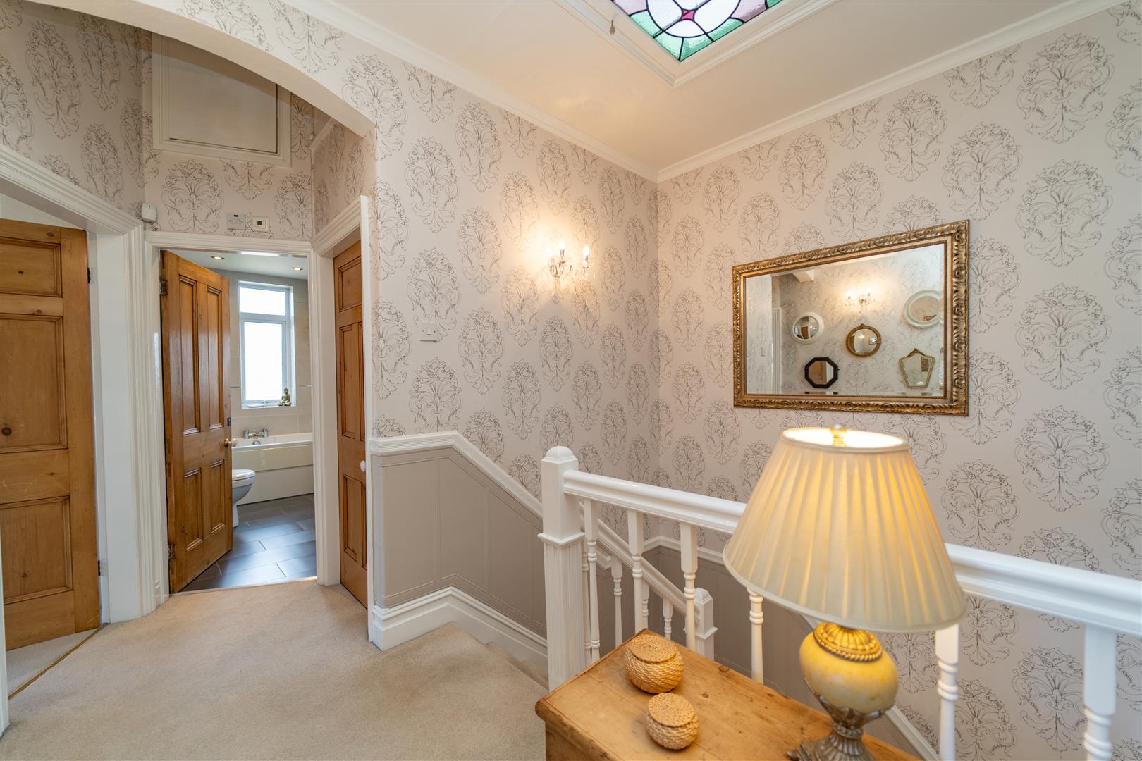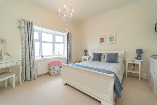 Stairs leading to the first-floor landing that provides access to a master bedroom with a feature bay window complete with stunning stained-glass panels, as well as a further three double bedrooms and three-piece bathroom.