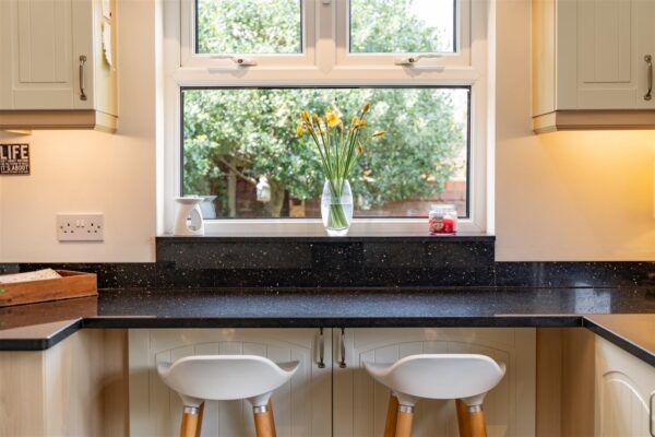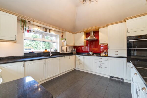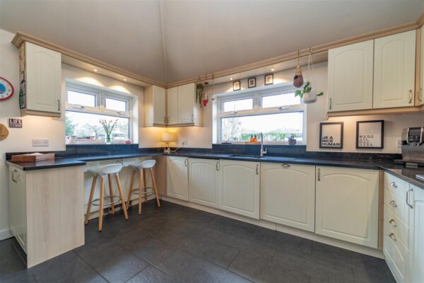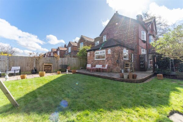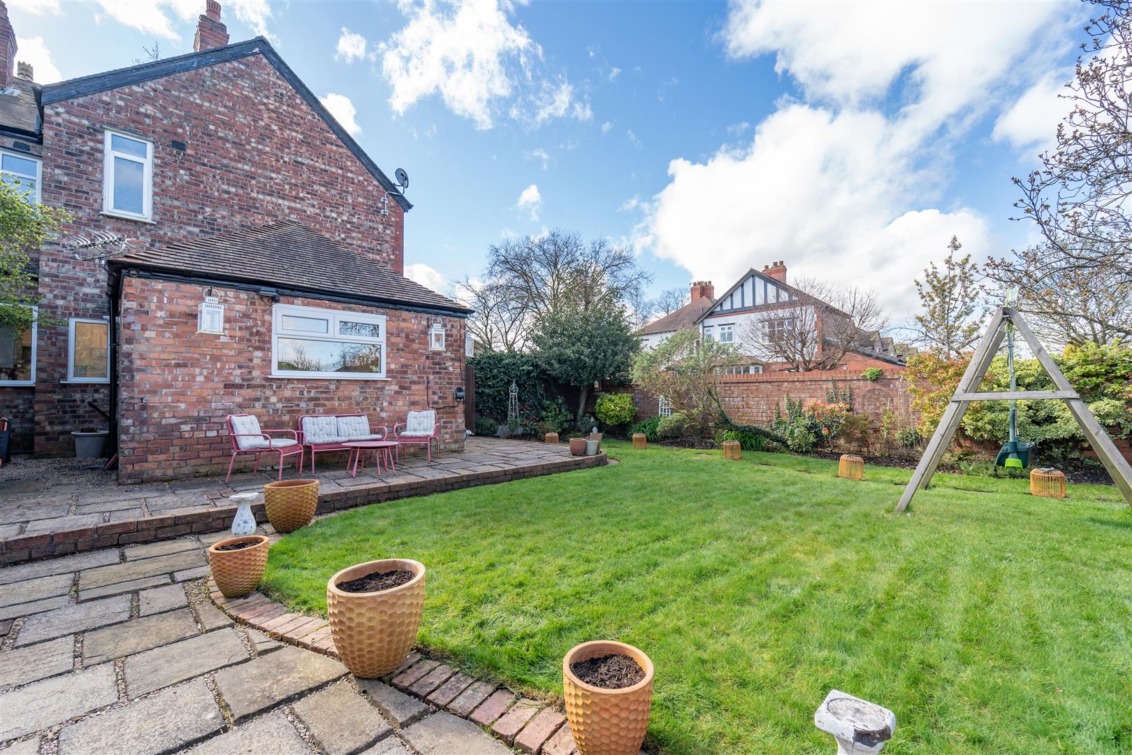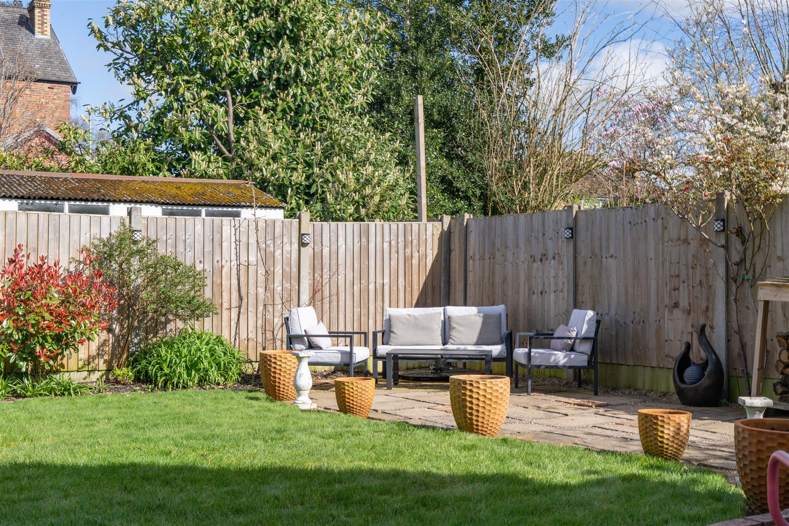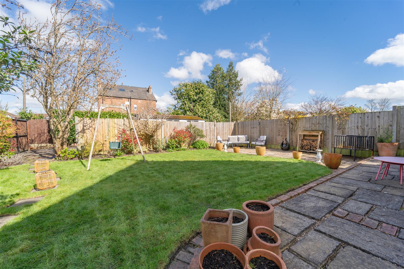 A charming low-level brick boundary wall features decorative iron pedestrian gates, inviting entry to a lawned front wrap around garden. To the rear of the property, a sizable lawned garden, enclosed by timber fencing. Flowerbeds beautifully line the lawn, additionally, a raised paved patio area offers the perfect spot for seating and relaxation. A separate gated and secluded driveway with a garage.