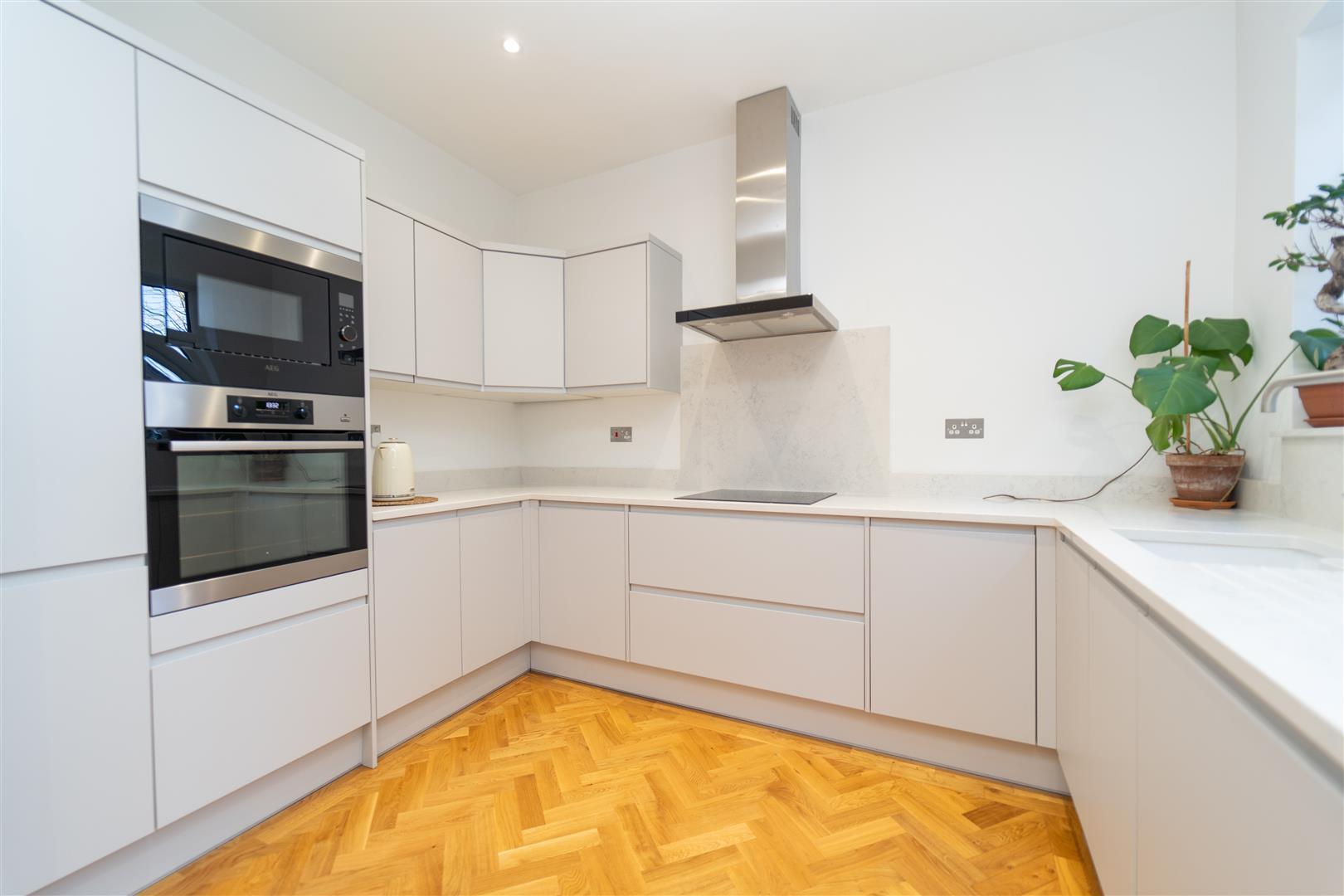 Upon entry, the well-designed layout unfolds, featuring an inviting entrance hall, a seamlessly connected through lounge/dining room, and a modern fitted matt kitchen/diner with block parquet flooring finishing the ground floor and access out into the rear enclosed lawned garden.