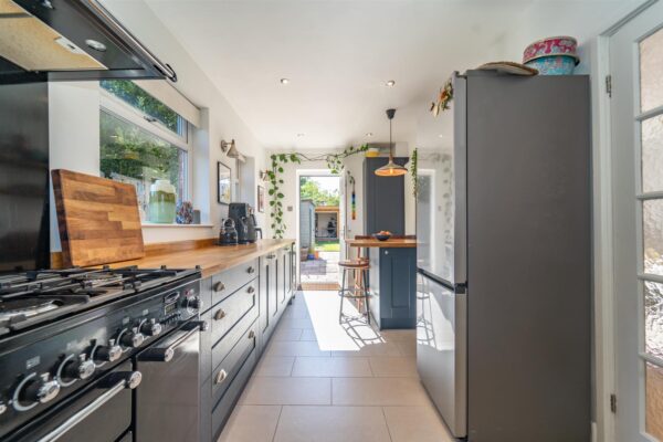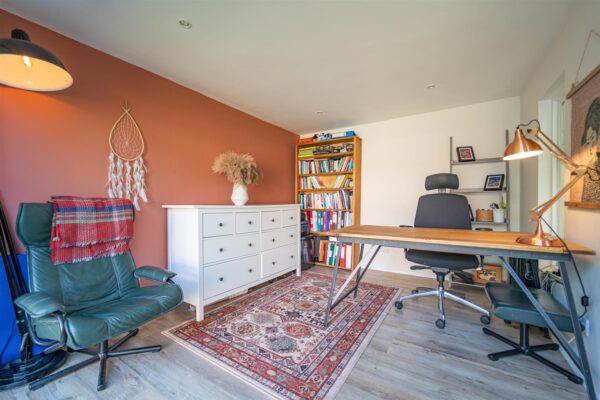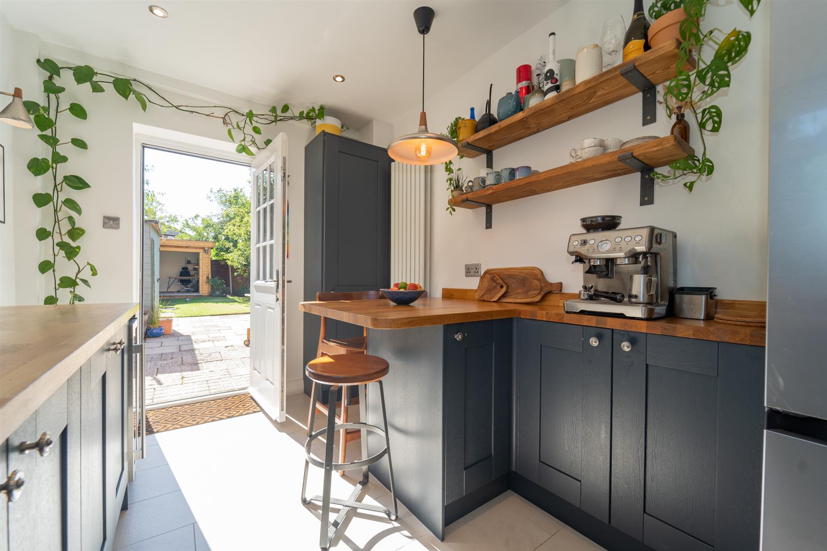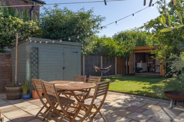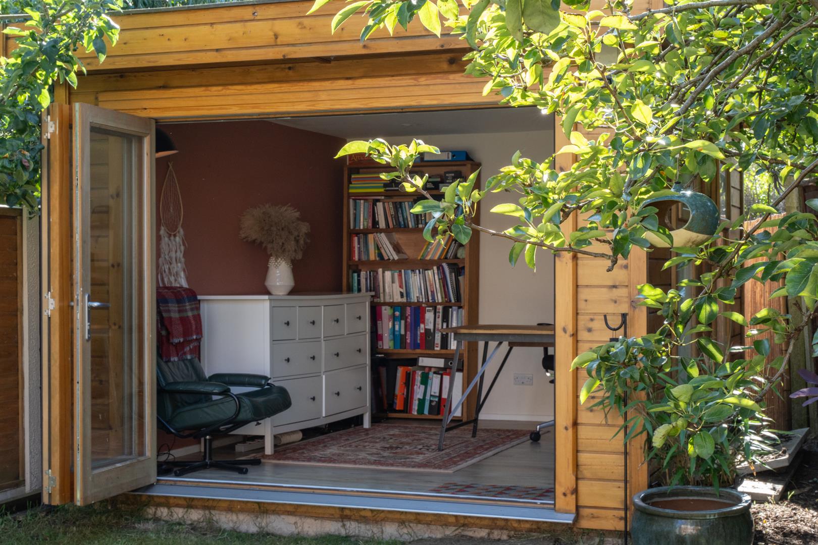 The front garden is enclosed by shrubs and a timber gate with a paved car parking space. To the rear, the beautifully maintained garden has a patio space perfect for outdoor dining and a lawned area surrounded with trees and shrubs. A unique addition to the rear garden is an outbuilding currently used as an office space.