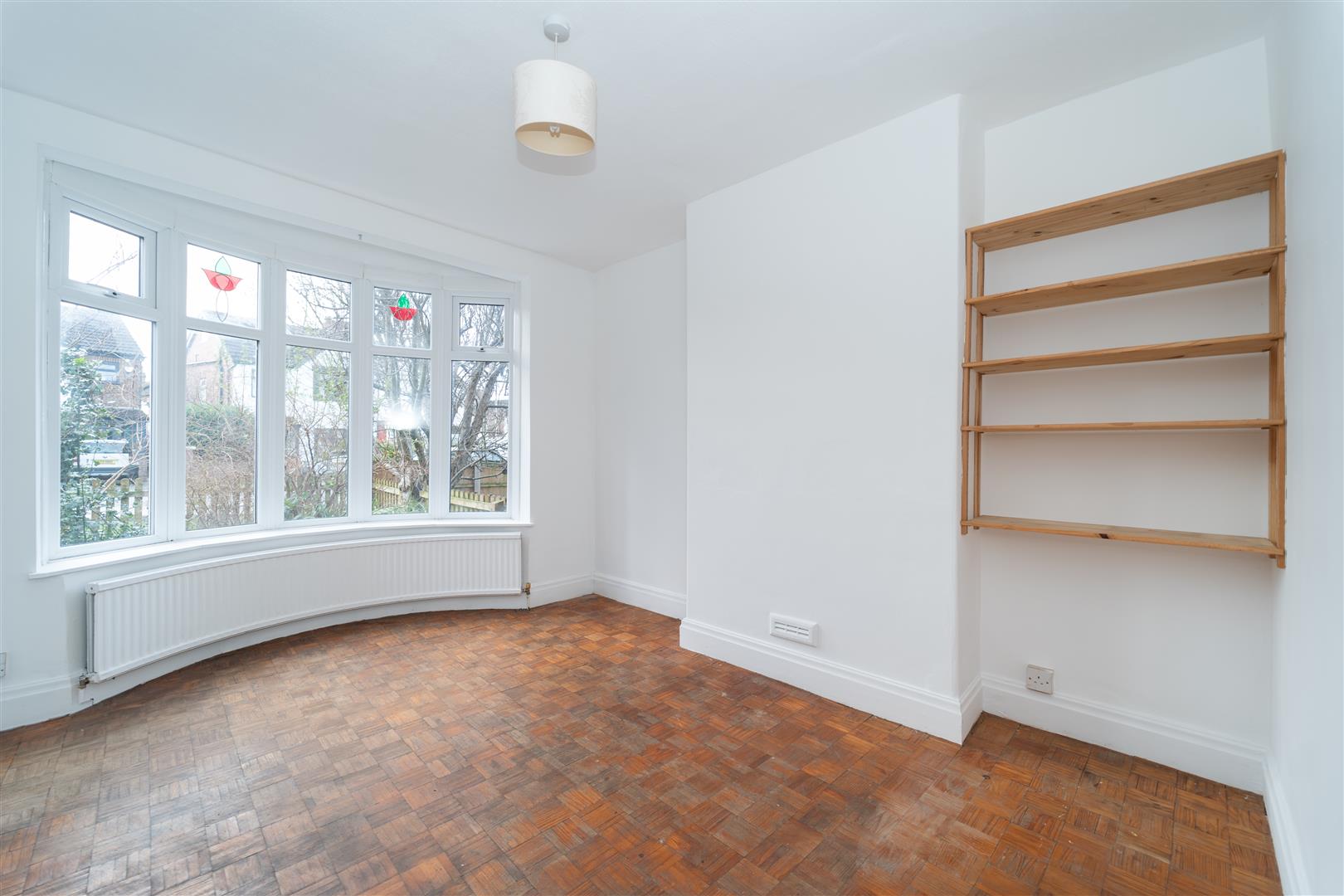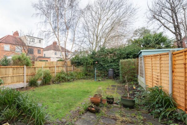 The property is enclosed with picket fencing and iron gates. A paved driveway provides convenient off-road parking, and a path leads to the front door. At the rear, a spacious lawned garden is bordered by flower beds, enclosed by timber fencing shared with neighbouring properties.