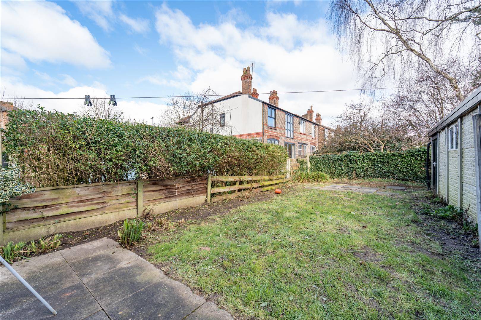 To the front aspect there is a low-level brick boundary wall, mature bushes and hedgerow and a large shared driveway providing off road parking. To the side aspect there is access through to the rear garden. To the rear aspect there is a well propertied lawned area, patio and a useful detached garage.