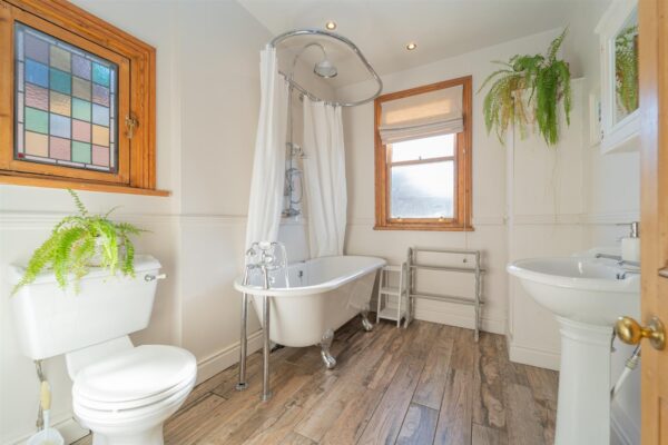 storage, stripped and varnished floor boards and cast-iron fireplaces, all adding to the charm of this stunning home; and a contemporary three-piece bathroom with roll-top bath and useful built in storage.