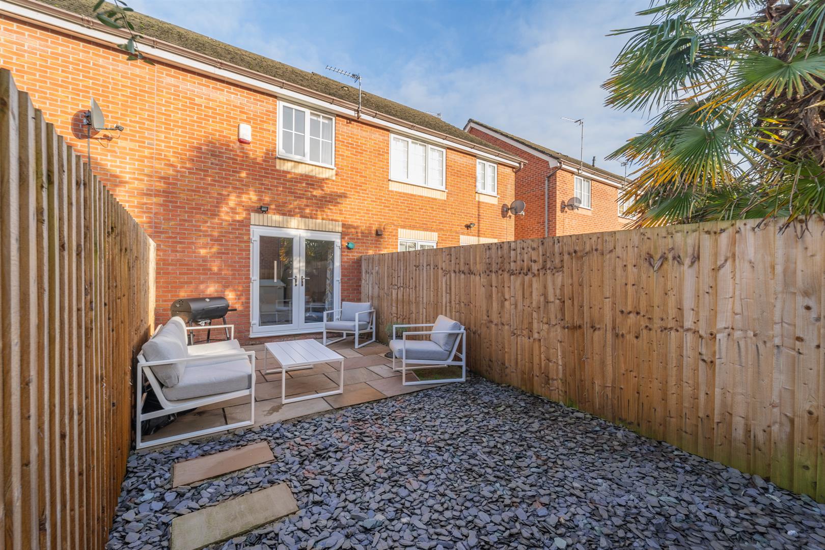 Stepping into the rear aspect, discover a patio area ideal for setting up chairs and a table, perfect for relaxation and dining. Decorative stones, bordered by timber fencing that ensures both privacy and a pleasant aesthetic. Accessible through gated entry, the rear opens into a communal alleyway.