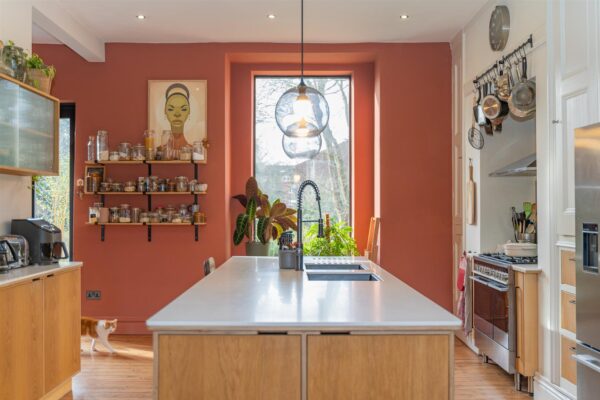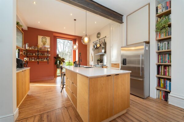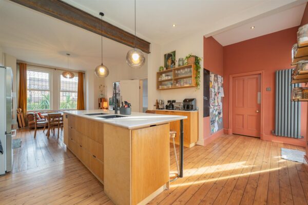 Entry is at ground level, an impressive entrance hallway with varnished floor boards, access through to the lounge area with bay window featuring original lead glass windows, cast iron fireplace and high ceilings to the front aspect. There is a truly beautiful fitted kitchen with French doors leading out onto a raised deck and enclosed garden. Separate utility, W.C and understairs storage complete this floor.