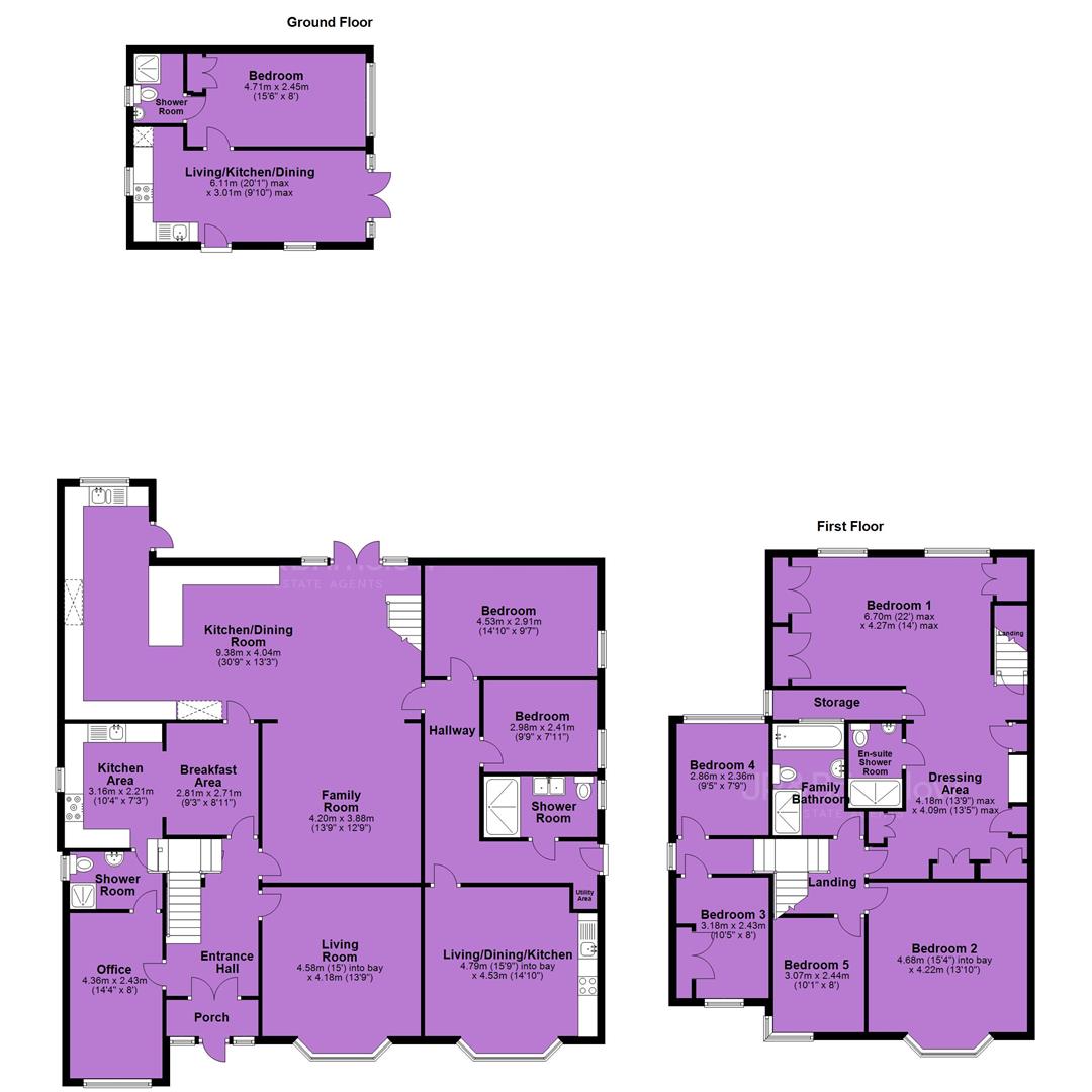 Whilst to the first floor there is a landing leading to five bedrooms, a four-piece family bathroom and the primary bedroom benefits from a dressing area, ensuite shower room and a useful storage cupboard.